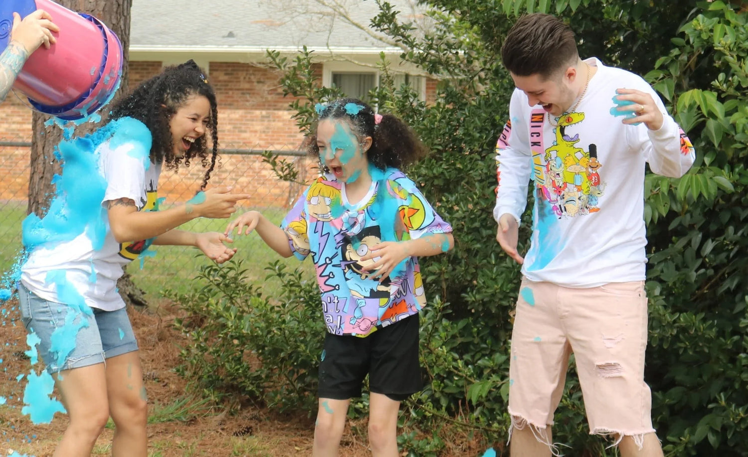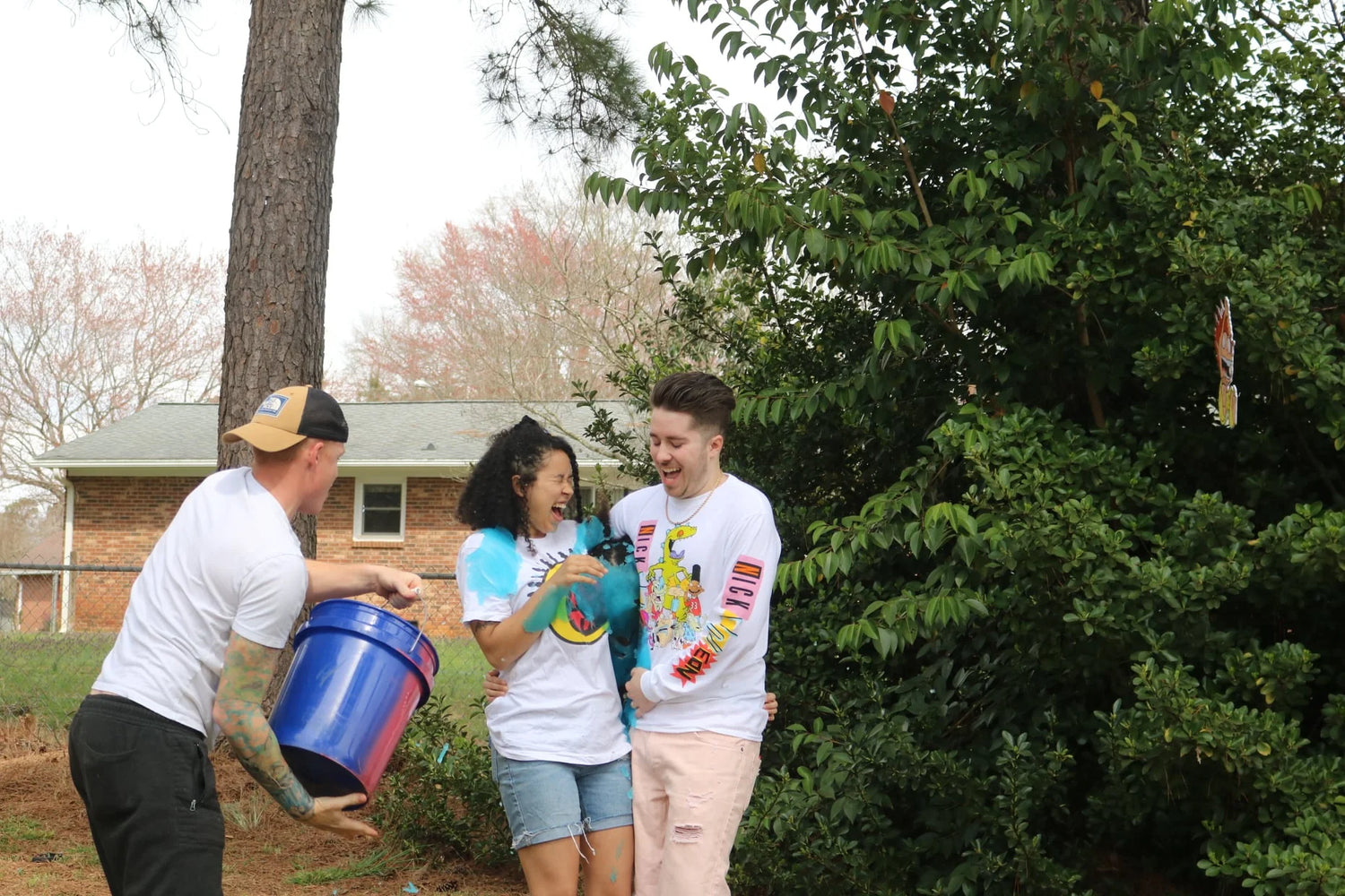 3. On ONE, the bucket with the correct colour of instant slime is then tipped over the expecting parents heads and bodies, revealing the gender of their bundle of joy!