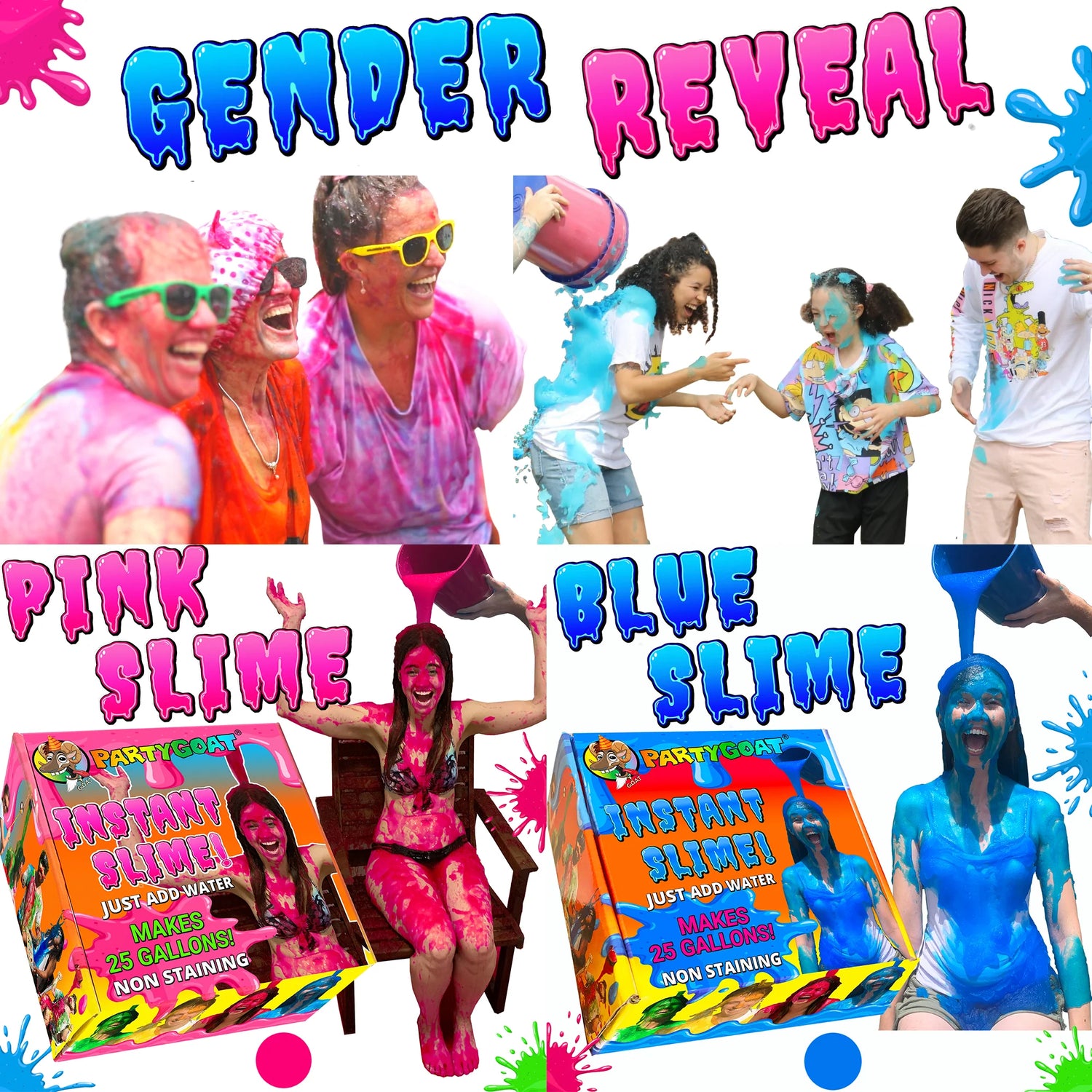 2. 2 x bags of Party GOAT™ Instant slime, blue and pink coloured. - You can make huge quantities of runny slime by simply adding water (another highly recommended option is to buy the 4 colour Slime Battle pack. After the reveal, hand out water blasters and use the remaining slime for a super fun slime fight amongst the willing party guests).