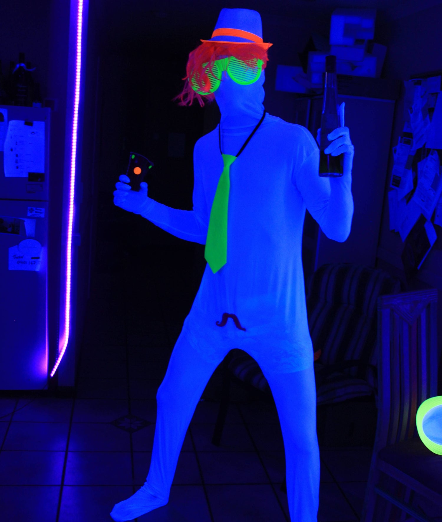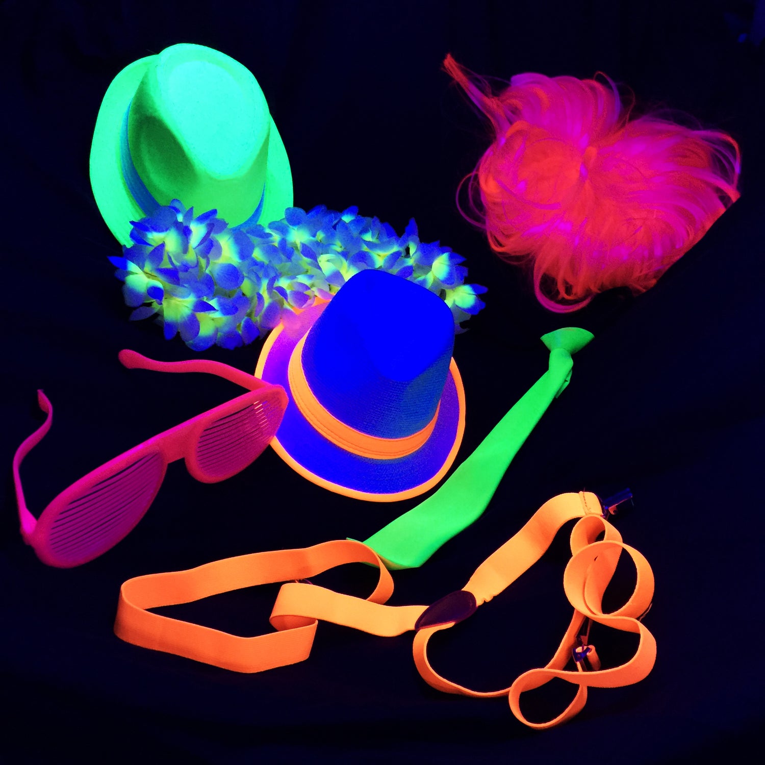 When selecting what to wear for a black light party you want to find glow party outfits and materials that are either white or fluorescent. The brighter the neon color the greater the chance that the item will glow. Fluorescent green, pink, yellow, and orange are the safest bets. You can get lucky with some purple, red and blue colors though these colors tend to be a little more hit and miss. Fluorescent cotton, polyester, spandex or paper materials are safe bets. Some party stores and websites (such as partycity.com) actually label items that glow under black lights to help you with your selection. The more color you can add to your costume the better, and crazy colored accessories are a must.