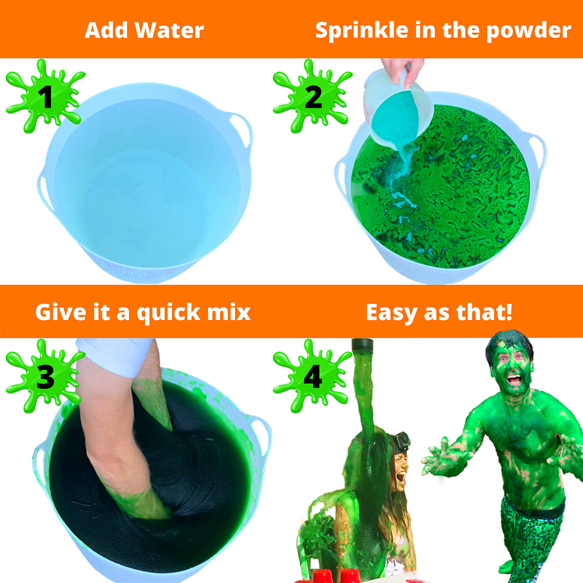 It's as easy as that! The slime powder will magically transform into a sloppy, slimy, goo in seconds!