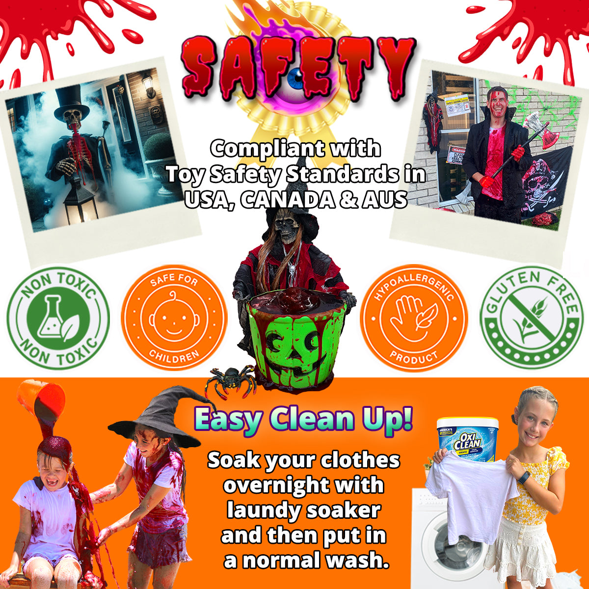 🩸 Safe & Easy Cleanup: Non-toxic, skin-safe, and easy to wash off (soak clothes overnight in a laundry soaker to remove stains). Great for pranks and special effects.